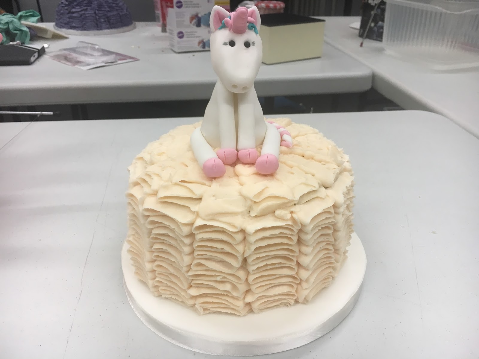 For my second class we was asked to bring in a pre-baked 6 inch round cake, so I made 3 vanilla sponges (my favourite cake). I also had to bring in a x3 batch of Vanilla Buttercream recipe that I then coloured with icing colour paste. Using a Wilton 104 pipping nozzle (my first use) I learned how to pipe ruffles onto a cake. To finish I placed my Unicorn figurine from the week before on top.