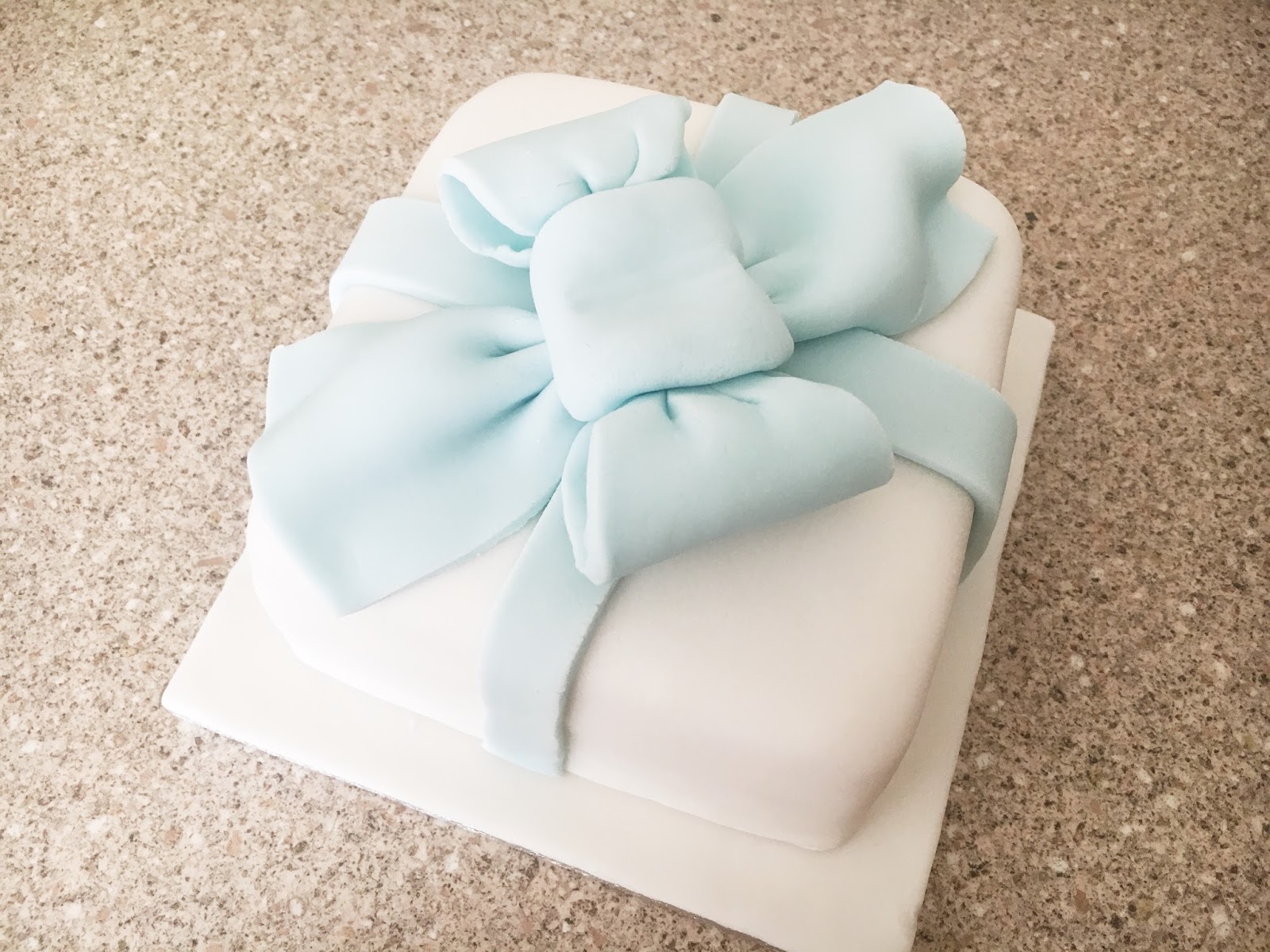 For my fourth class we had to bring in a pre-baked square cake to which we then made into a square gift box cake. Using ready to roll icing I learnt how to create a lovely ribbon and bow and place it onto an iced cake. This was by the far the most challenging week for me as it was very fiddly.