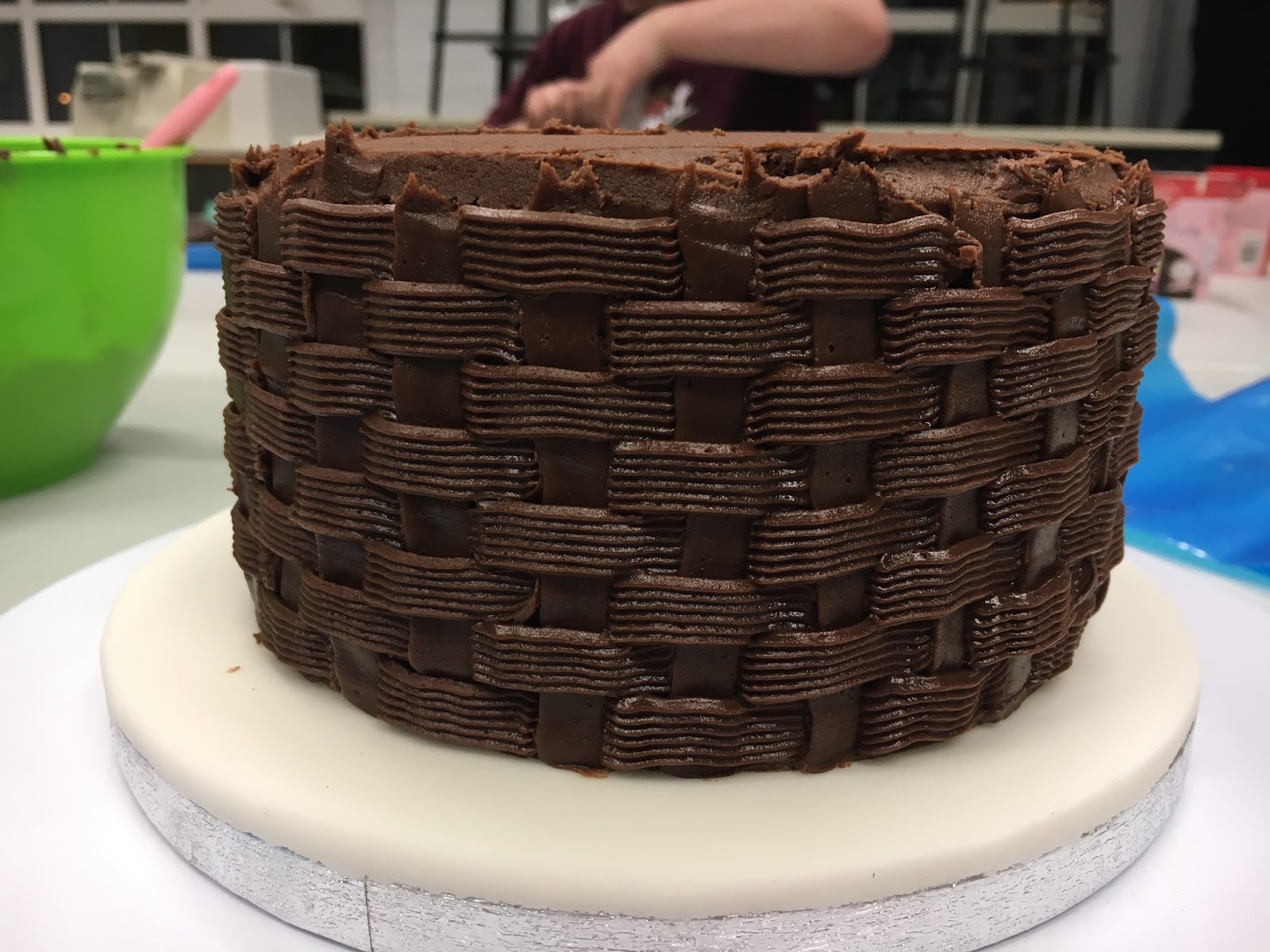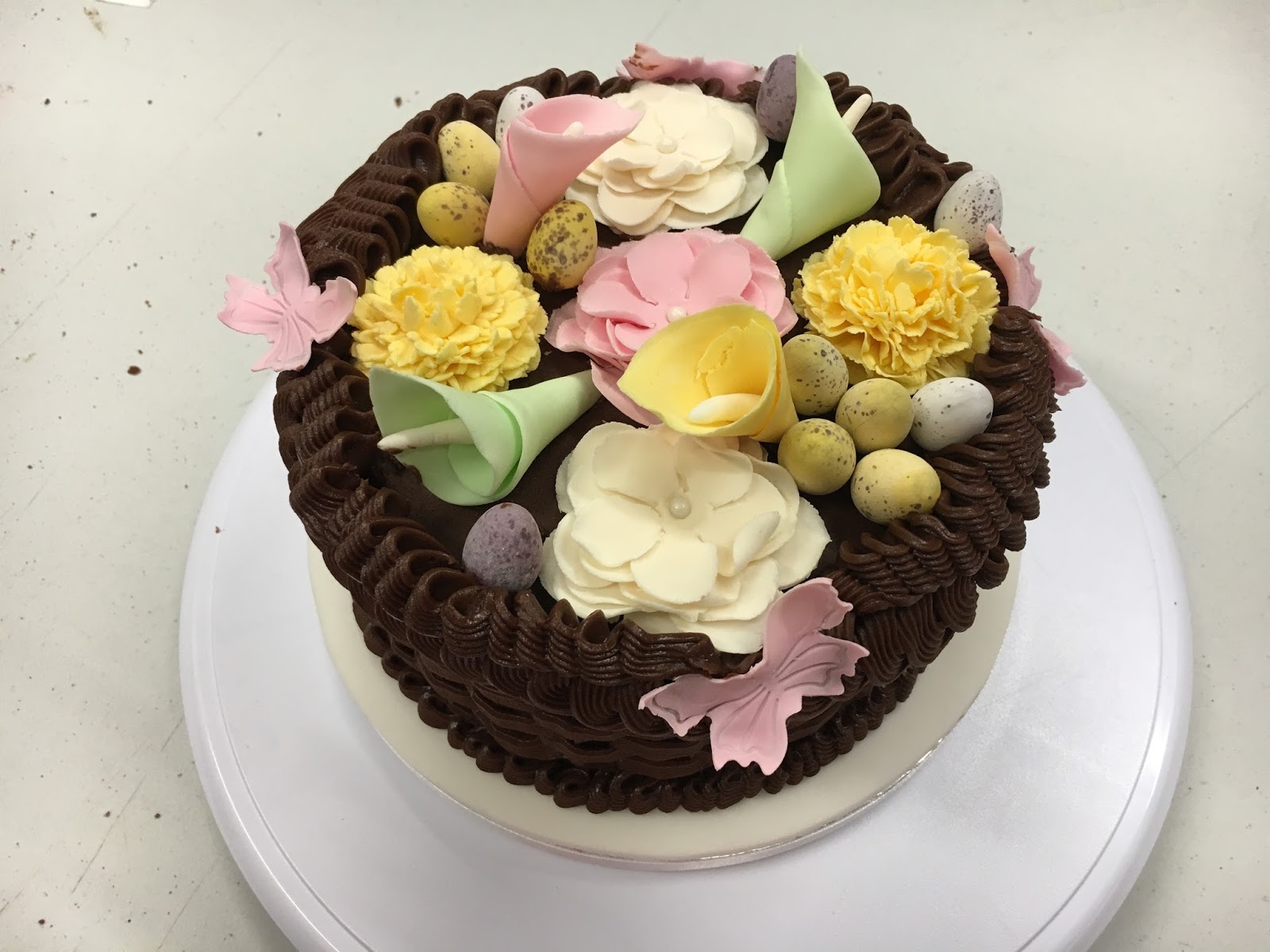 The final week of the course was a Chocolate Easter Basketweave Cake (the hardest creation was left until last). I baked a Cacao Chocolate Cake (my recipe here) ready for class and x3 bath of Cacao Buttercream. Using a number 47 nozzle I learned how to create a lovely basketweave piping around a cake which looked amazing and very realistic. To finish I decorated the top of the cake with the previous weeks sugar paste flowers and mini eggs (to which I ate most of in class!)