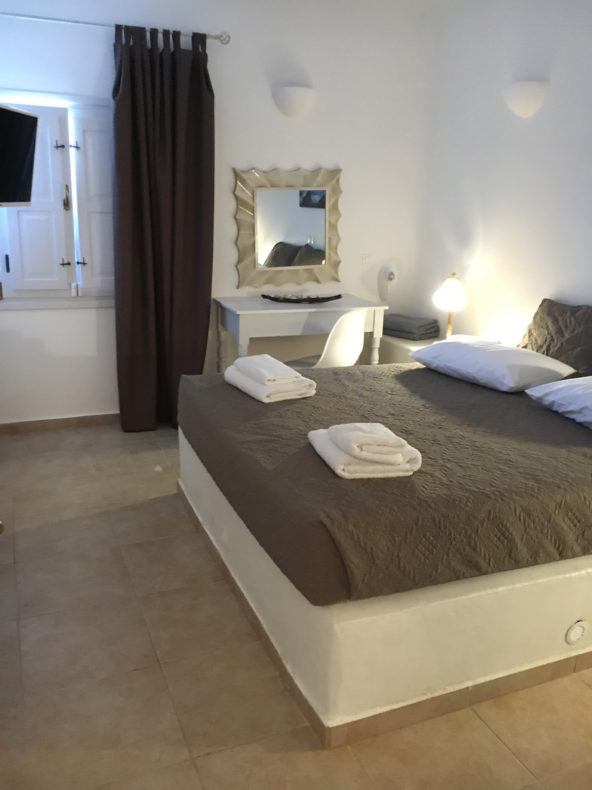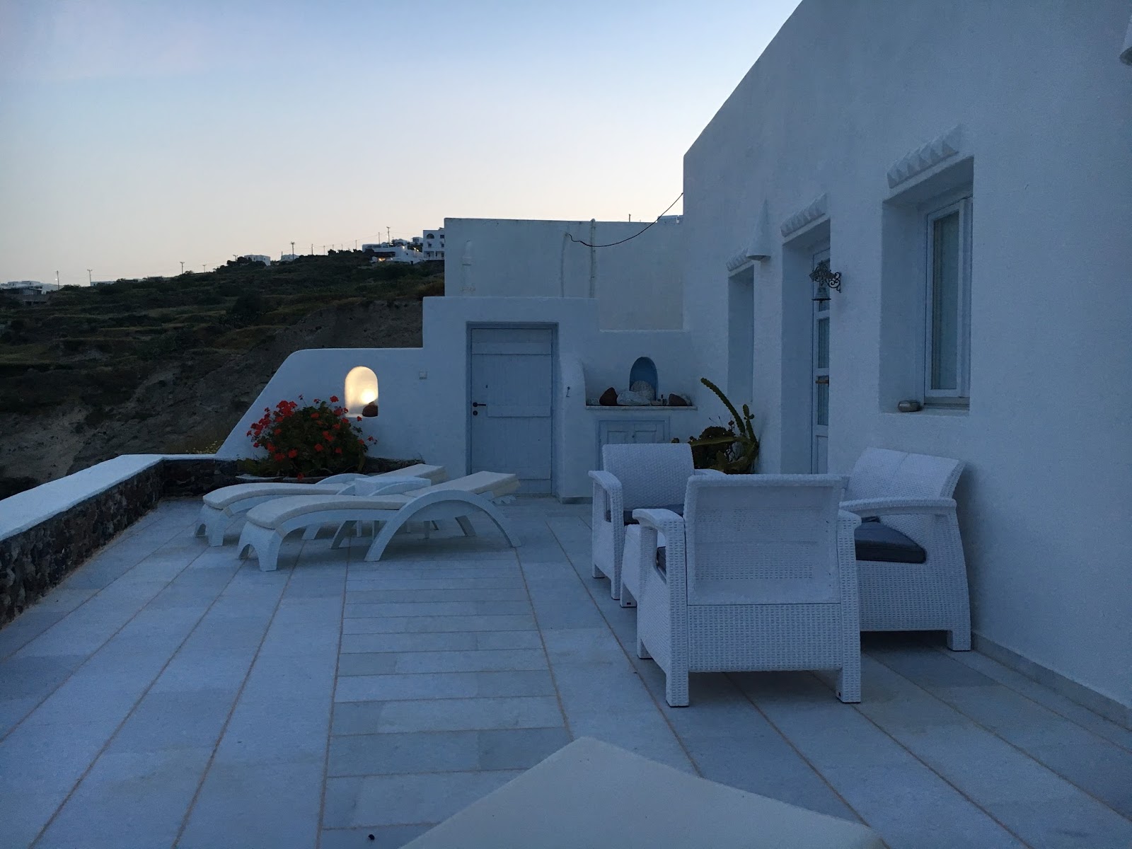 We arrived to a warm welcome from the lovely Dimi who was always on hand to provide us with information and help. She gave us a detailed description of the best things to do and see on the island. We were supplied with a mobile phone and free wifi (brilliant wifi) which enabled us to contact her and taxi’s throughout our stay. Santorini is a very hilly island and even though everything is in walking distance the steep slopes make it difficult to walk to the nearest amenities and the local town, so the mobile came in handy to ring a taxi which was always less than 10 minutes away. We would always agree a price with our driver before setting off as there was 5 of us travelling.