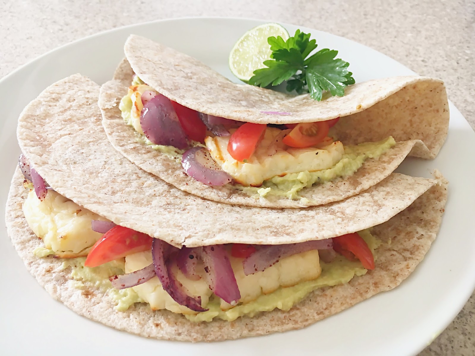 Heat the Piada in a hot dry pan for a minute or so and place on to a serving plate and with a spoon spread over avocado like a spread, lay the halloumi on top, followed by the onions and tomatoes and finally the parsley