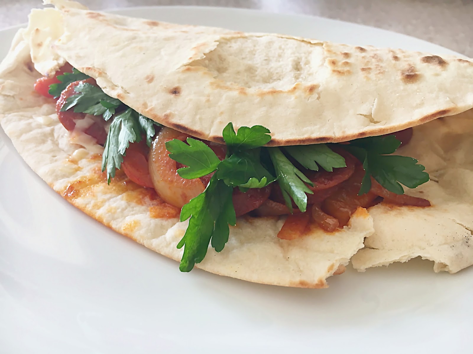 Fill the piada with the chorizo filling and sprinkle on the parsley and serve